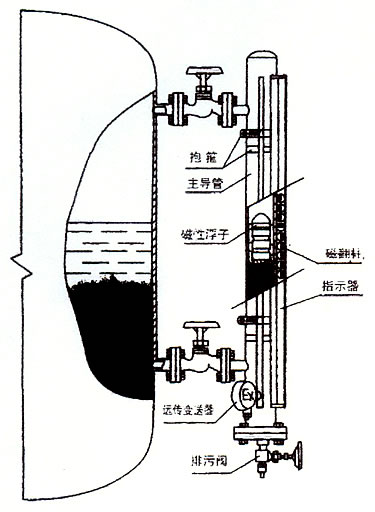 主體管經由過程法蘭毗連在儲液罐上,跟著容器內液位的高低變更,動員含磁鋼的浮子高低挪動,在全封鎖的管中,只要浮子跟著液體高低挪動。